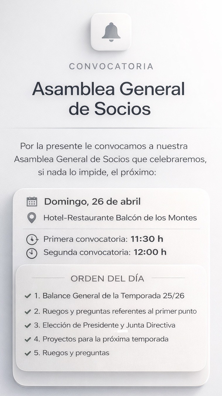 Por la presente le convocamos a nuestra ASAMBLEA GENERAL DE SOCIOS que celebraremos, si nada lo impide, el próximo domingo día 27 DE ABRIL en el HOTEL-RESTAURANTE BALCÓN DE LOS MONTES, a las 11:30 de la mañana en primera convocatoria y a las 12:00 del mediodía en segunda, con el siguiente